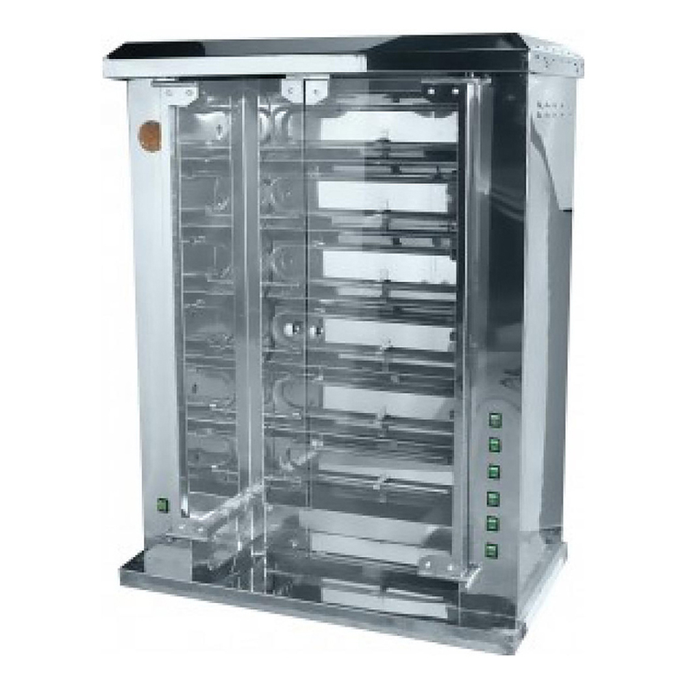Длина, мм. 950 Ширина, мм. 430 Высота, мм.1280 Напряжение, В 380 Количество кур 18 Количество ТЭНов 6 Тип гриля шампурный