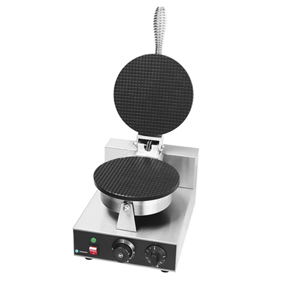 250x360x270мм, 1,2кВт, 220В, 6,4 кг, диаметр вафли 200мм, материал корпуса нержавеющая сталь, материал жарочных поверхностей — литой алюминий с антипригарным покрытием, одна круглая рабочая поверхность для изготовления одной круглой тонкой вафли на рожок, температурный режим 50-300C
