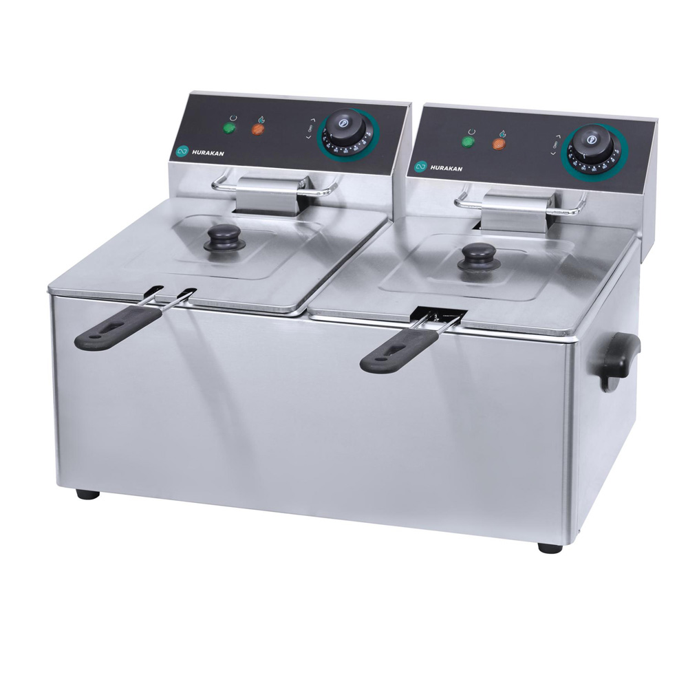538x415x345мм, 6,5кВт, 220В, 11кг, 2 ванны емкостью 8 л с крышками, 2 фритюрные корзины, температурный режим 60-200 С, размер корзины (без ручки) 234x186x146мм